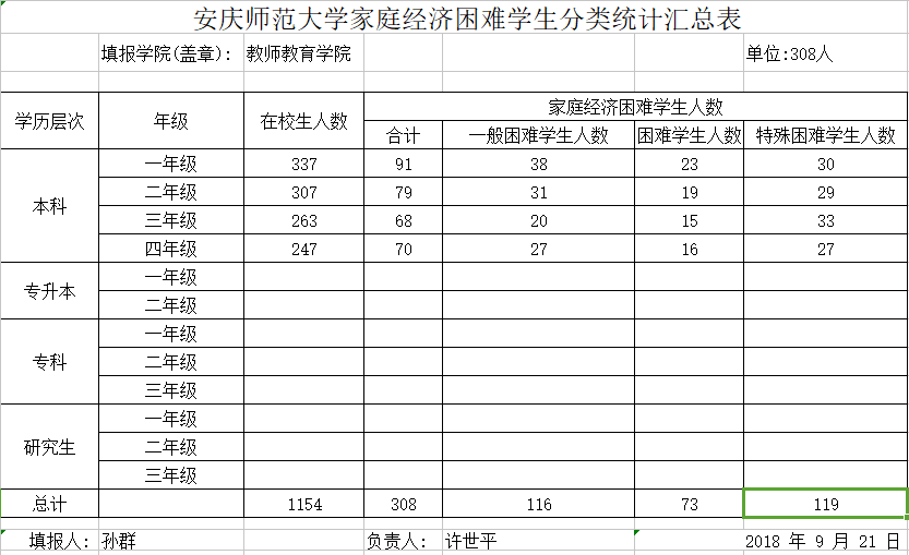 教师教育学院家庭经济困难学生分类统计汇总表