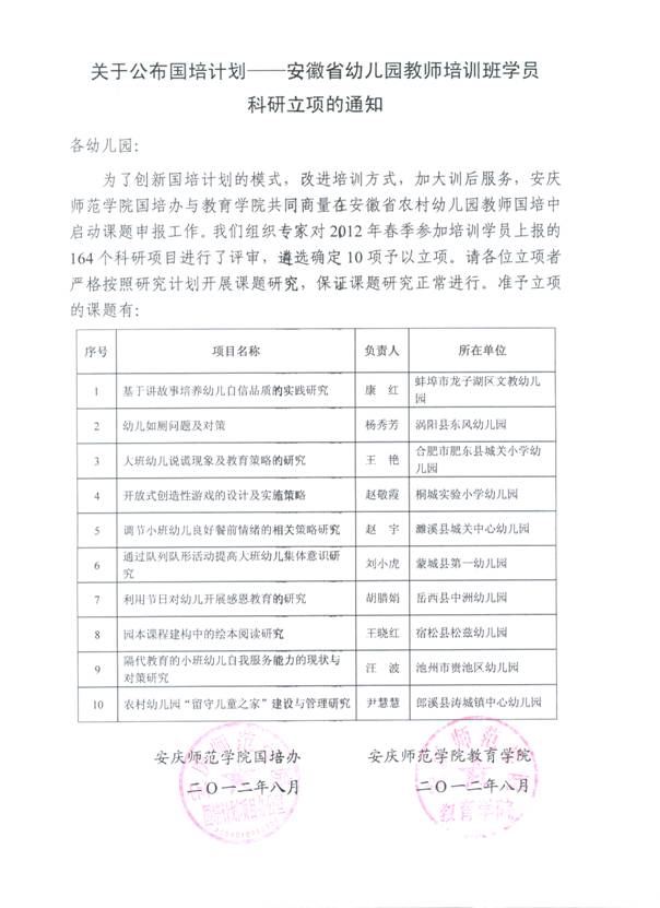 关于公布国培计划——安徽省幼儿园教师培训班学员科研立项的通知
