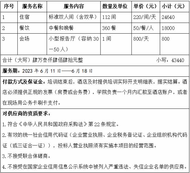 (1)住宿按220元(含双早)每天每间计算,酒店必须预备足够标准间供培训学员使用。同时必须保证在培训期间房间卫生整洁干净、空调正常运行、热水足量供给。