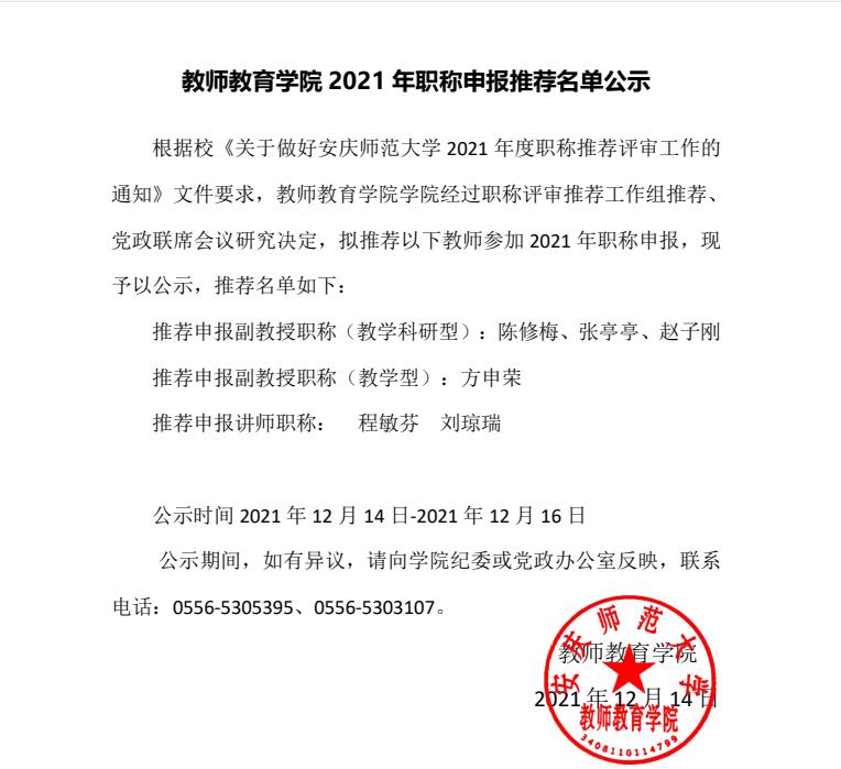 教师教育学院2021年职称申报推荐名单公示