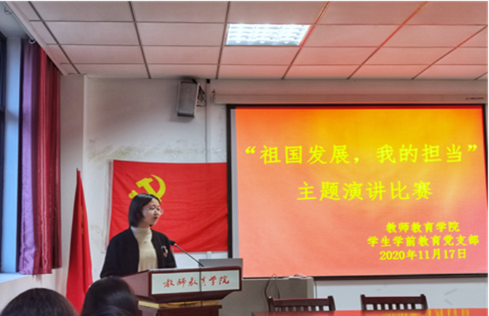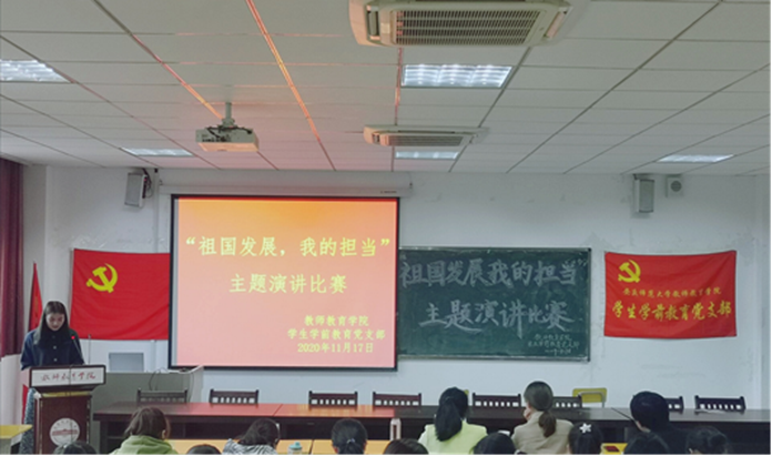 11月17日下午4时30分,教师教育学院学生学前教育党支部举办的“祖国发展,我的担当”演讲比赛在J305教室拉开帷幕。本次比赛由付能倩同学主持,学院老师方泽宇、张亭亭、唐道琴担任评委。参与点评此次演讲比赛旨在弘扬同学们的爱国热情,培养同学们以爱国主义为核心的民族精神和以改革创新为核心的时代精神,培养青年大学生的使命感和责任担当。