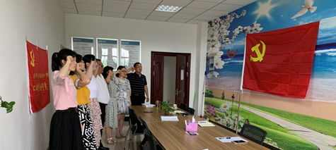 党课结束之后,在王皓宇的带领下,大家列队整齐,举起右手,在鲜红的党旗下庄严宣誓:我志愿加入中国共产党……永不叛党。十二句八十字的入党誓词,字字千钧,句句誓言,每一个字、每一句话,大家都诵读得十分庄重、认真。重温誓词的过程,也是大家重温使命,重新接受洗礼的过程。党性意识和党性观念在重温誓词的过程中得到了强化,思想境界得到了净化和提升。(撰稿:胡慧  摄影:张平  审核:陈志超)