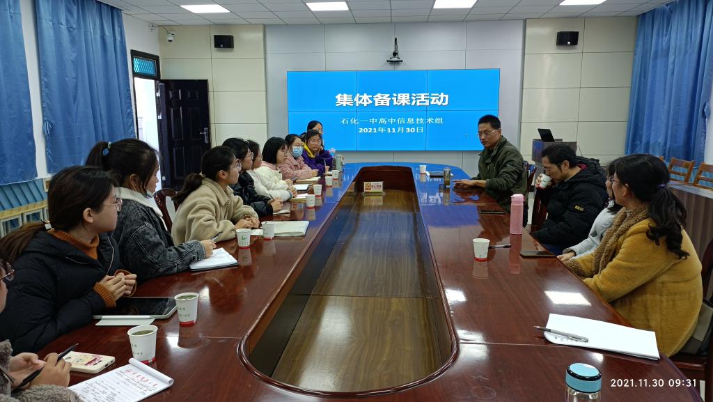 上午,研习师生参加了高中信息技术组集体备课活动,教导处副主任、信息中心主任何钧军,信息技术教师俞婷、欧阳涛、石晓熹、陆飞等出席,活动由全国信息技术优质课比赛最高等级奖获得者蒋丰老师主持。欧阳老师向研习师生介绍了石化一中的校园安防系统,演示了部分功能和操作,强调了信息技术教师在校园信息化建设中发挥的重要作用。接着,俞老师采用无生授课方式,以“算法及其描述”为主题,为研习师生奉献了一场非常精彩的示范教学。她由解密游戏引出算法的基本概念、基本特点,进而围绕该游戏的设计非常具体生动地讲述了算法描述的三种方法、程序设计的三种结构。与会师生都认为,教学设计巧妙,并且大道至简,逻辑性强,知识点层层递进、深入浅出。随后,研习师生还就智慧教育、智慧课堂、课堂管理、教学设计等问题与石化一中信息技术教师进行了深入交流。