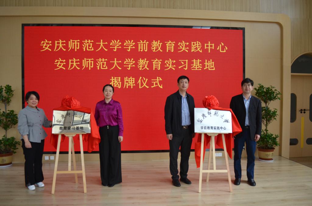 4月26日上午, 学校在附属龙城幼儿园举行教育实习基地、学前教育实践中心揭牌仪式。党委常委、副校长吴琼,宜秀区政府副区长张婷出席仪式。宜秀区教体工委书记、教体局局长朱华兵,教师教育学院党委书记陈志超,学院党委委员、执行院长吴云助,学院党委副书记、纪委书记许世平,附属龙城幼儿园全体教师等参加仪式。仪式由附属龙城幼儿园园长姚萍主持。