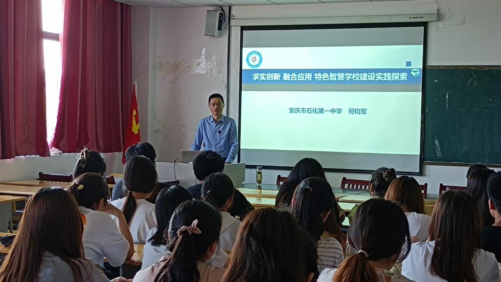 何钧军首先以石化一中获安徽省首批中小学智慧学校示范学校为切入点,阐述了国家、省市智慧学校建设的背景与历程。其次重点围绕两大建设(环境建设+人才队伍建设)和五大智慧(智慧教学、智慧学习、智慧管理、智慧生活、智慧文化),描述了石化一中积极落实教育信息化2.0,不断推进智慧学校建设的相关举措,包括软硬件配置、智慧平台和智慧课堂教学培训、数字化资源设计培训等,并且借助国家、省、市一师一优课、信息化大赛、六项电教学术作品、新媒体新技术创新应用课堂教学优质课评选、智慧学校教学应用典型课例征集等活动平台的作用,促进石化一中智慧校园建设,培养全体教师智慧教学意识,为智慧校园建设实践探索创造出良好氛围。再次,何老师还谈到石化一中利用智慧校园建设,围绕高中信息技术新课标中的学科核心素养开展了丰富多彩的学生社团活动。最后,何老师向学生推荐了很多优质的学科资源,勉励大家多实践、多思考、多交流。