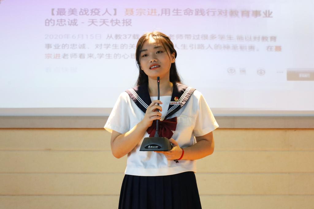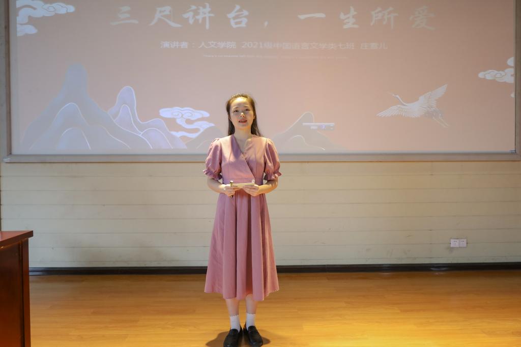“10多年来,张桂梅老师走过11万公里的家访路,走进1000多名学生的家……”在一段轻缓的纯音乐中,小学教育专业2021(1)班的杨楠开始了演讲,她在演讲稿中详细介绍了张桂梅的事迹。“我从高中起就开始关注师德模范张桂梅老师,她的事迹给了我学习、生活等方面莫大的激励与鼓舞!”