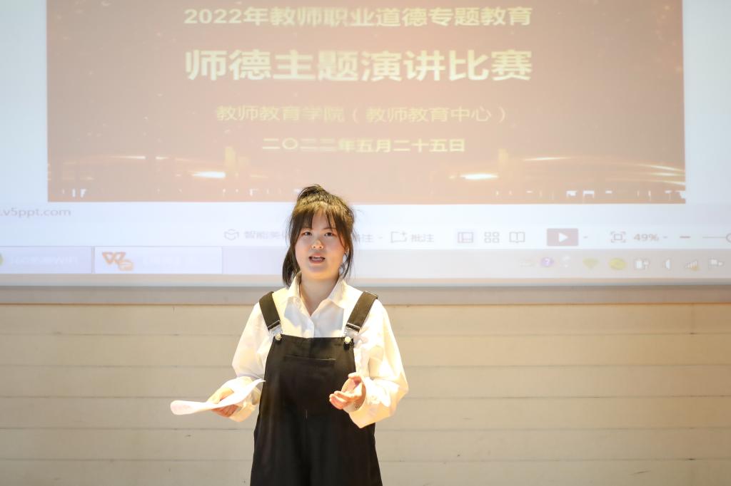“在比赛中,我看到了许多优秀的同龄人在做老师、培养师德这方面的散发的自信。”中国语言文学类专业2021(3)班的赵雨菲认为,作为一名师范类的学生,学习师德是师范类学生的必经之路,她希望能够通过此次演讲比赛学习其他学生的优秀经验、拓展进步空间,同时开拓眼界、为自己设立目标。