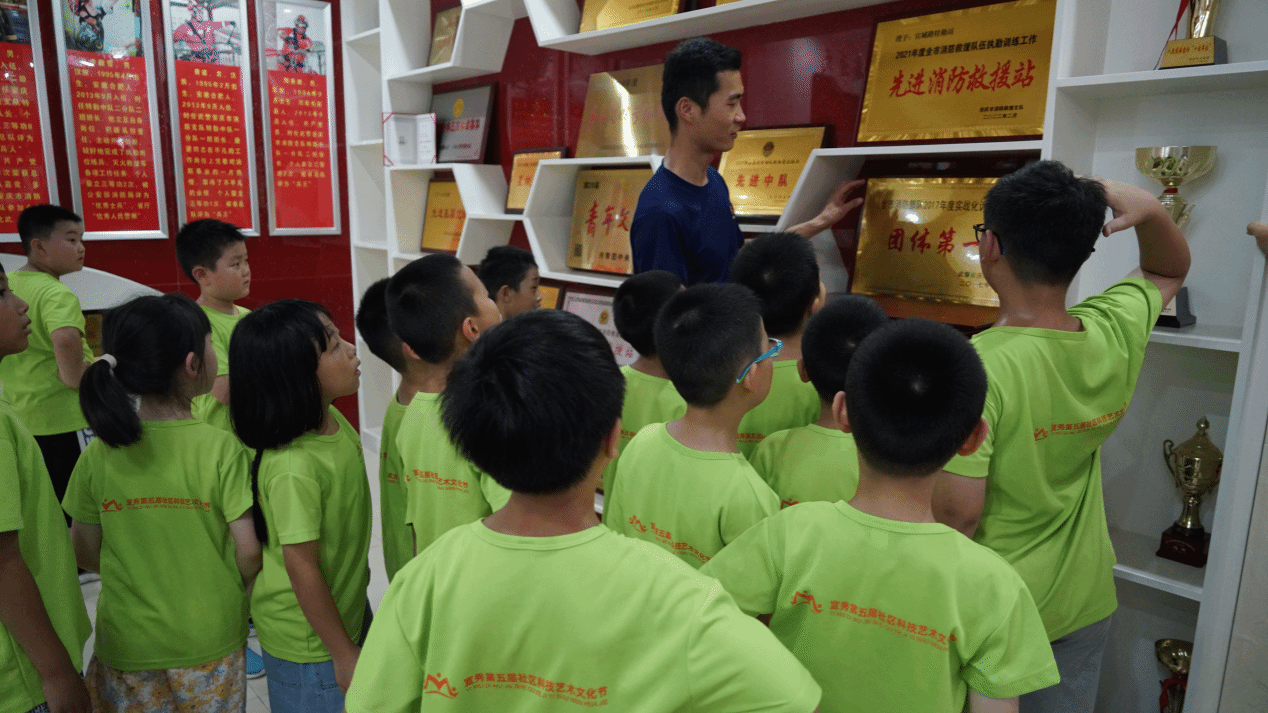 在消防队员的带领下,小朋友们来到队史馆,通过一张张见证过不同时期抢险救援现场的照片及一次次救援行动纪实的文字图片资料,凝聚了消防员们的勇敢无畏和无私奉献,让孩子们充分了解消防救援人员赴汤蹈火、英勇顽强、不怕牺牲的优良战斗作风和非同寻常的救援经历。孩子们还参观了消防救援人员生活区域,消防救援人员为小朋友们认真讲解了如何将被子叠成“豆腐块”形状,听完讲解后,小朋友们跃跃欲试,分组开始练习叠被子。同学们亲眼观察消防队的环境,亲身经历消防队的日常生活,了解到消队员从事各种救险工作的辛苦。