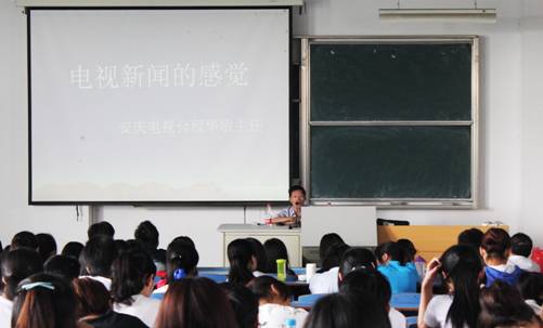 6月2日上午,安庆电视台98色花堂主任程华敏在D208教室做了一场题为“电视新闻的感觉”的讲座,讲座由教育学院副院长韩建华主持,广播电视新闻学教研室全体老师和150余名学生聆听了讲座。