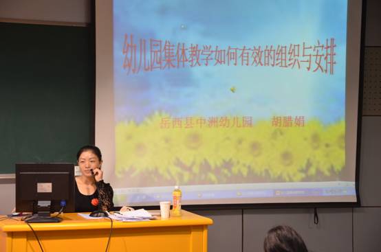 9月24日上午,来自岳西县中洲幼儿园的胡腊娟老师在文渊楼406教室为国培班90余名幼儿骨干教师做了一场以“如何有效组织和安排幼儿园集体教学”为主题的讲座。