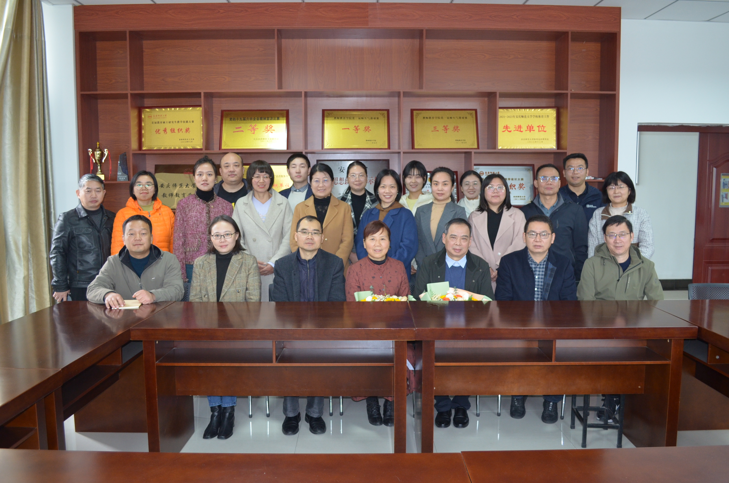 在J202会议室举行张启树、陈琳老师荣退座谈会。学院领导班子成员、全体行政人员及小学教育全体教师和学生代表参加座谈会。