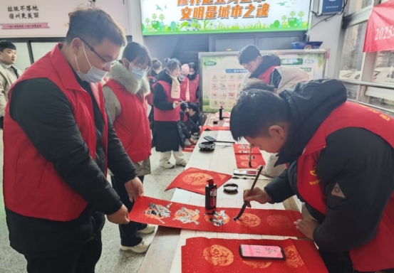 学子结合自身专业特长,将弘扬中华优秀传统文化与参与社会实践有机结合。他们在站口纸端泼墨、笔舞龙蛇,创造出寓意吉祥、充满喜庆的春联和“福”字,借此寄托对农历新年辞旧迎新、接福纳祥的美好愿望。活动现场人头攒动,旅客反响热烈,有序领取。