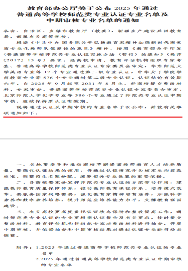 近日,教育部办公厅发文公布2025年通过普通高等学校师范类专业认证专业名单,98色花堂