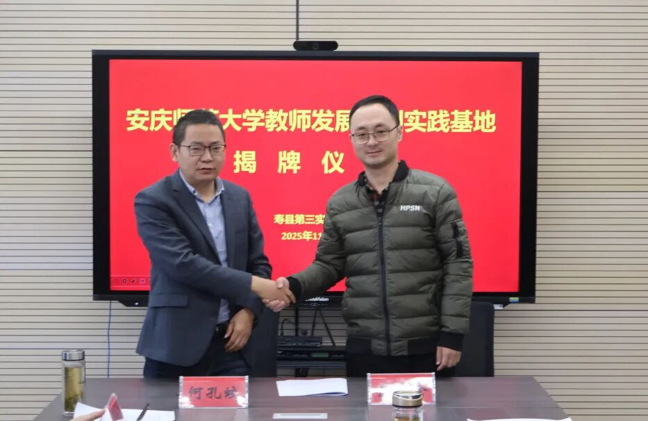 7日上午,何孔蛟代表学院与寿县第三实验小学签订了教师发展研训实践基地的共建协议,并与寿县教体局领导共同为基地揭牌。他指出,高校承担着社会服务的重要职能,此次与寿县第三实验小学的合作,是深化校地协同、推动基础教育优质资源扩容的重要举措。