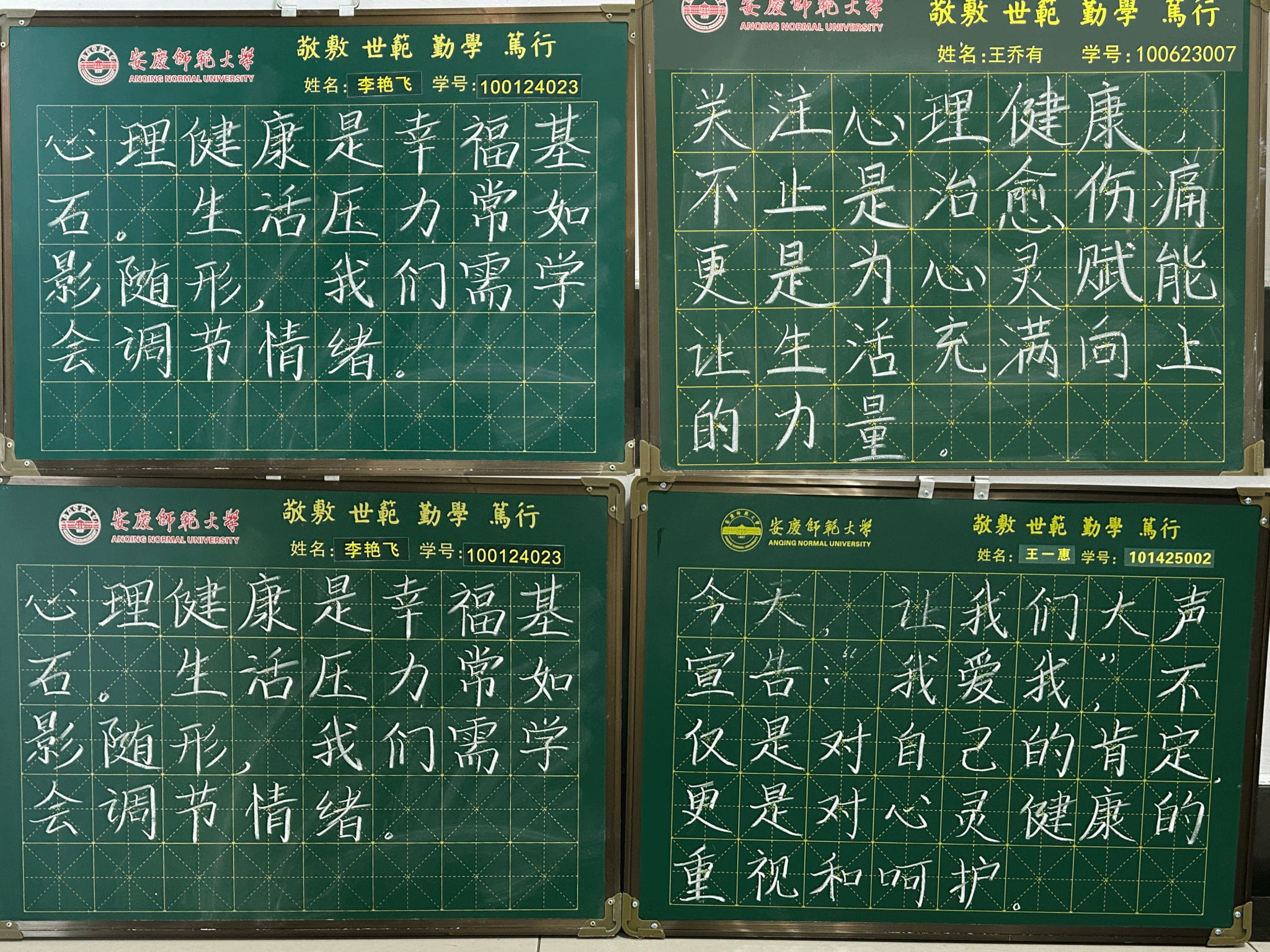 同时,学院大学生未来教育家协会也紧扣“心理健康与生命价值教育”主题,同步开展心理健康教育主题粉笔字创作活动。“心理健康是幸福基石”“关注心理健康”“我爱我”,协会成员用工整隽秀的字体,积极传递自爱自护的成长理念。一幅幅饱含关怀的作品,或阐释情绪调节的重要意义,或呼吁对心灵健康的高度重视。以传统书写艺术为载体,让心理健康与生命价值的意义在笔尖流转、在校园传扬,吸引学院师生驻足品读、深刻铭记。
