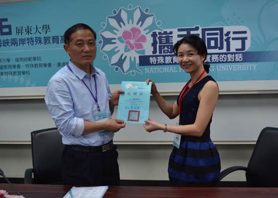 我校教育学院院长曹长德主持了主题为“特殊教育支持系统”的论坛,在会上曹长德针对大陆和台湾在特殊教育支持系统存在的差异方面发表了观点,他表示:台湾特殊教育的师资比远远超过大陆,作为高校应该重点培养特殊教育人才,弥补当前特教人员严重不足的现象,并且注重教师素养的提升。特殊教育学校应向综合化发展方向,承担指导中心、资源提供输出、义务教育、康复训练和职业教育等功能,而作为特殊教育指导中心必须实行行政管理权、专业指导权、督导评估权“三权合一”。台湾屏东大学为表达曹长德院长对本次论坛的贡献,特发感谢状以示感谢。