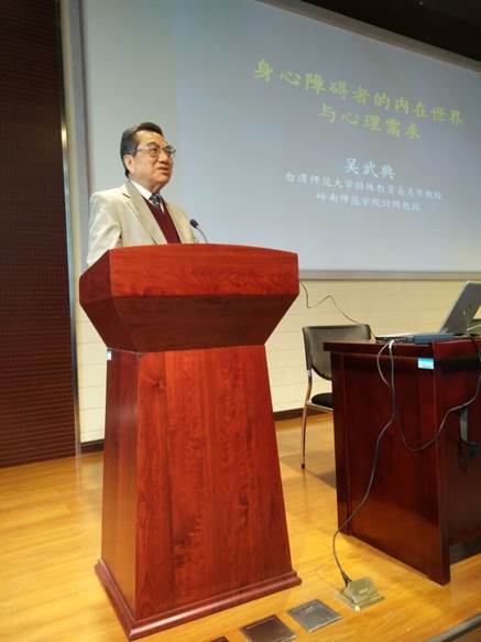 4月13日,台湾师范大学特殊教育学系名誉教授、广东岭南师范学院特聘教授吴武典应教育学院邀请来我校讲学。13日上午9:00吴教授在D111作了《身心障碍学生的内在世界与心理需求》的专业报告,参加此次报告的有教育学院特殊教育专业的老师和学生,特殊教育学校和特殊教育康复机构的老师以及部分特殊儿童家长,报告会由郭启华教授主持。