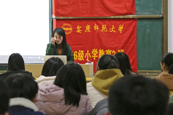 近日,该校小学教育专业2016(2)班的全体学生来到教室,在班级团支书黄耀的组织下,他们开始了本学期第一次主题班会,主题为“你大一期间做过什么让你觉得遗憾和后悔的事情”。50名学生轮流上台发言,每个人根据自己的实际情况分享了自己的经历。