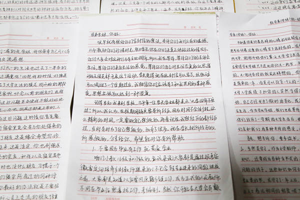 当天,50名学生安静地坐在教室里思索着,他们把自己一年来的“错误”经历写在信里,告诉学弟学妹们以后不要“重蹈覆辙”。“千万别挂科!一定要好好学习专业课!”黄新培写下自己大一期间最后悔的事情,就是没能平衡好专业学习与实践活动的关系,导致在期末考试挂科。他说,写信其实也是一个反思的过程,希望自己今后不要再做让自己后悔的事情。
