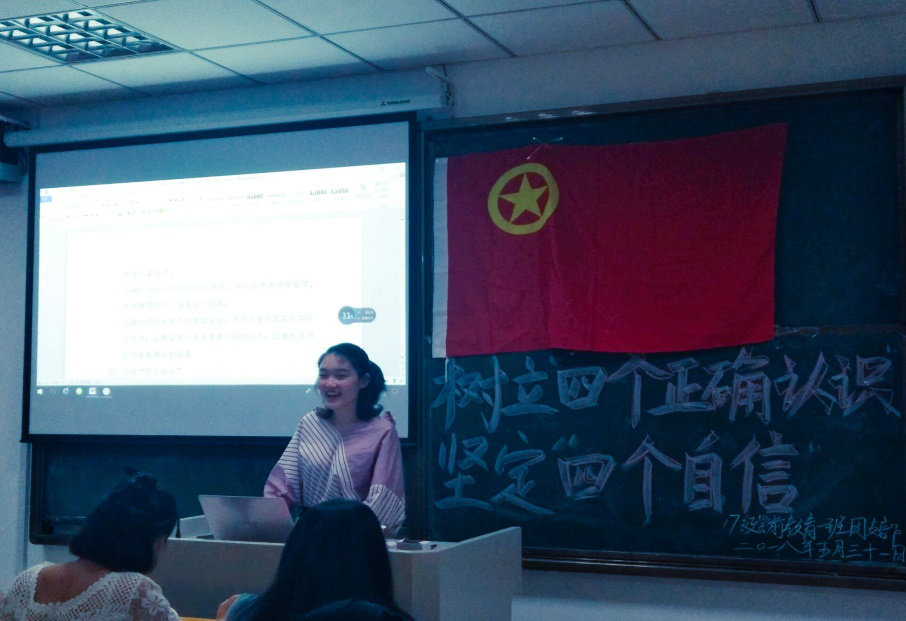 在以树立“四个正确认识”,坚定“四个自信”为主题的团课学习活动中,团支书夏多媛与支部成员共同学习研讨习近平总书记5月2日考察北京大学时的重要讲话精神中对广大青年提出的几点希望与习近平总书记5月4日在纪念马克思诞辰200周年大会上的重要讲话精神。支部成员经过认真的团课学习后,总结出当代大学生一是要爱国,忠于祖国,忠于人民。二是要励志,立鸿鹄志,做奋斗者。三是要求真,求真学问,练真本领。四是要力行,知行合一,做实干家。 在“成才不负青云志,报国常怀赤子心”的主题演讲团日活动中,支部成员踊跃参加,各位选手以饱满的热情进行激情洋溢的演讲,坚定地喊出其少年青云志,明确“为中华之崛起而读书”的信念。