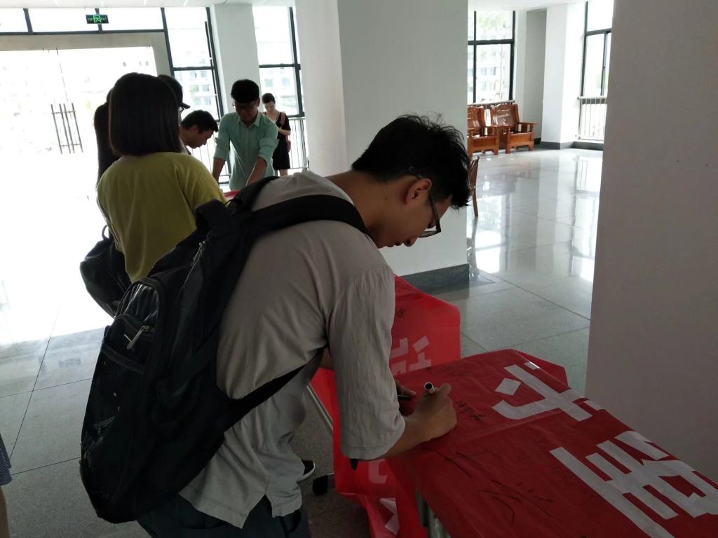 期末考试临近,为达到考试最终的目的,考出学生真实的水平,2018年6月28日上午两节课后,教师教育学院分团委学生会学习实践部向全院学生发起诚信考试的倡议,在教师教育学院一楼大厅开展诚信考试签名活动。教师教育学院的同学们纷纷响应,参加本次活动,用笔杆写下了自己的姓名。