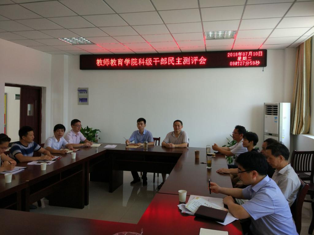 7月10日上午,教师教育学院在学院会议室召开科级干部民主测评会,学院领导班子成员、党支部书记、科级干部、教研室(实验室)负责人、辅导员、分工会主席共19人参加,学校组织部邓汉卿老师发放和回收了测评表,测评会由院分党委书记曹长德主持。