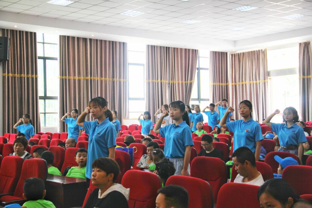 最后,志愿者代表陈芷怡上台,带领全体志愿者宣誓;志愿者们郑重承诺会恪尽职守,认真负责,保证每个孩子的人身安全。