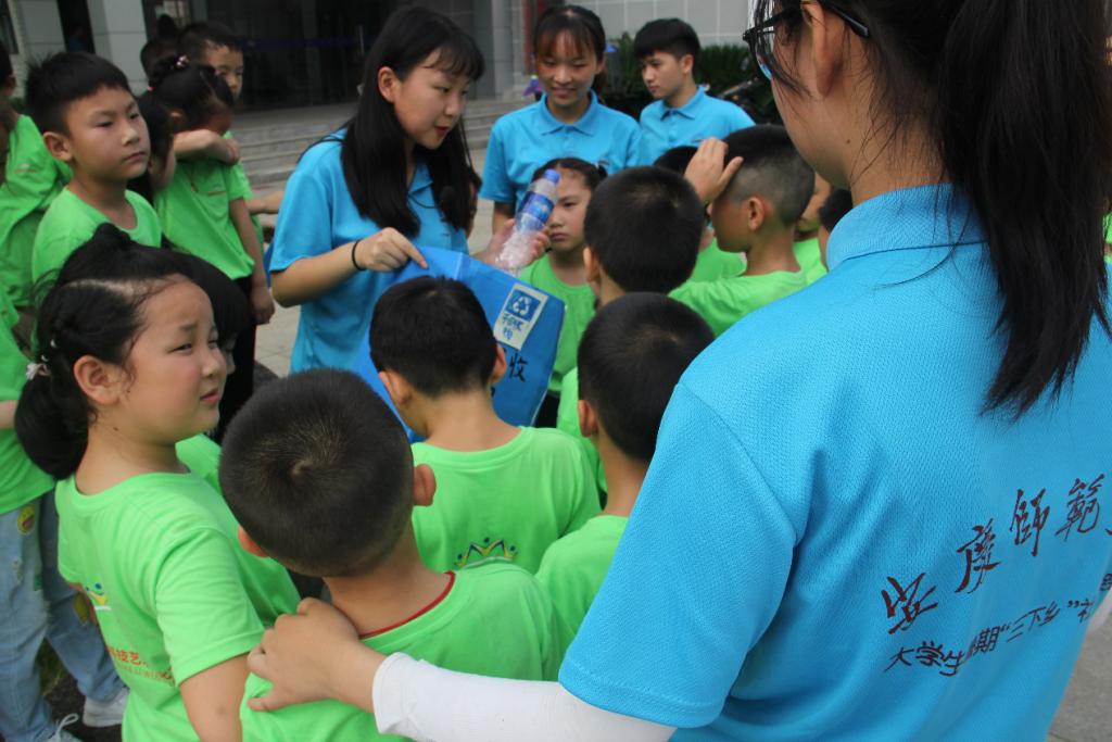 看着这些孩子们迫不及待的表情。支教老师王盼归说:“塑料有很多种,但不一定全是可回收垃圾哦,废料桶可能有残留的有毒废料,对环境和人体还有动物都可能造成伤害。”在解答完孩子们的疑惑后,支教老师带领学生到附近广场进行了垃圾寻宝游戏。