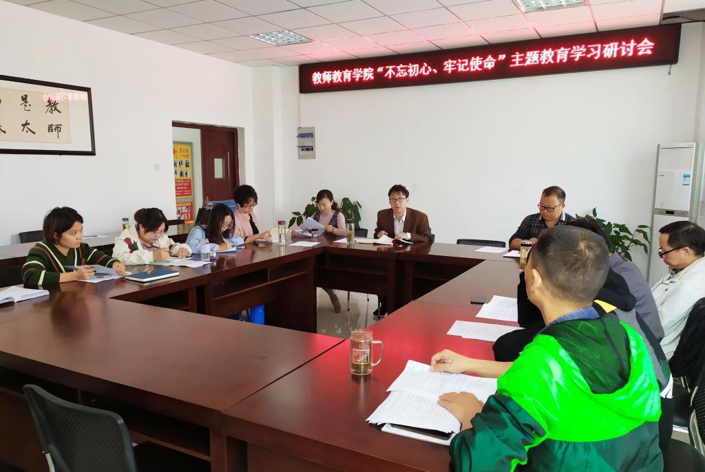 10月14日上午,教师教育学院召开党委理论学习中心组扩大会议,开展“不忘初心、牢记使命”主题教育集中学习研讨,会议由党委副书记许世平主持,党委委员和支部书记参加会议。