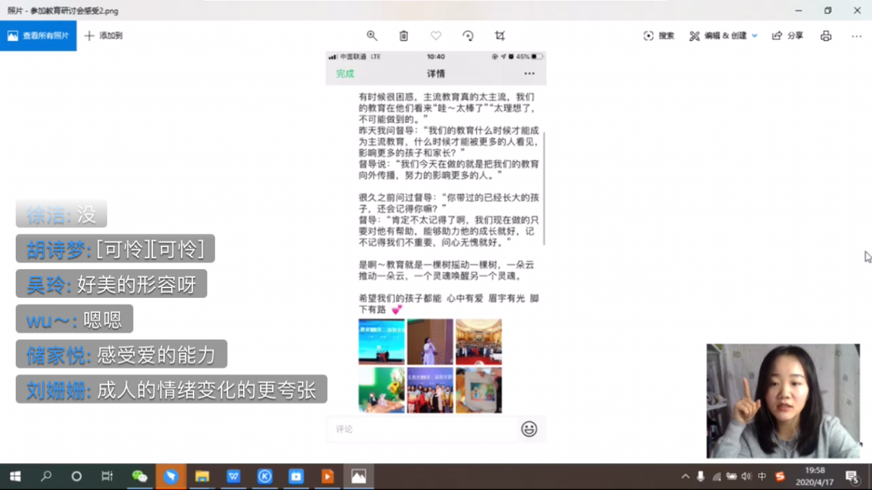 学前教育2017届毕业生高珊,现为北京芭学园教师,应学前教育教研室邀请,通过钉钉直播开展了一场主题为“我在芭学园当老师”的经验分享会,学前教育专业教师及148名学生参与了此次活动。