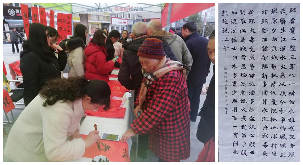 在学好书法的同时,王小蝶同学愿意利用自己的书法特长去帮助更多的人。2019年10月,她受聘为学院师范生教学基本功训练“小先生”,积极帮助其他同学提高书法水平;2020年1月,随邓石如书法班到安庆市人民路参与“迎新送福”活动,义务为安庆市民书写春联,深受广大市民欢迎;参与邓石如书法班“送春联”活动,为全校师生书写春联。在这次全民“战疫”中,王小蝶代表学院学生用书法的名义书写战胜新冠疫情的信心和决心。