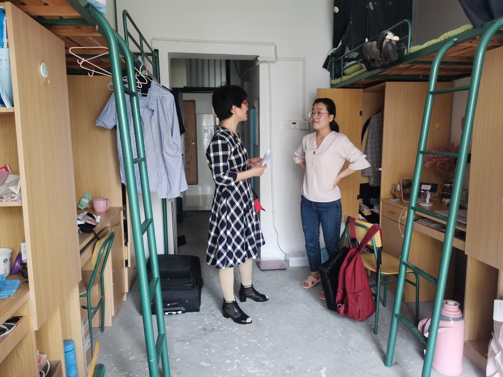 党委副书记许世平的安排部署下,黄玉、姚强诚两位辅导员赴14号楼逐一走访返校研究生寝室。