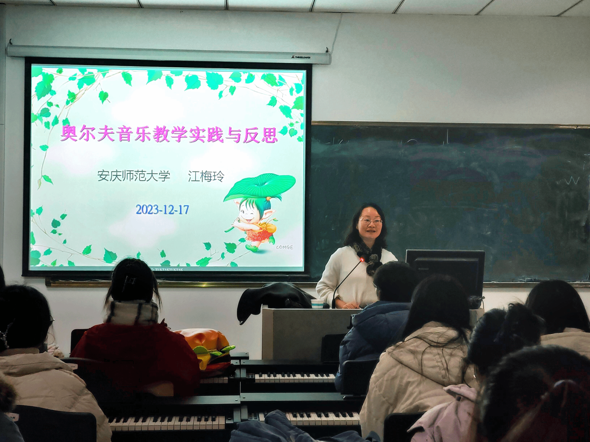 12月17日,教师教育学院江梅玲老师在J506教室作了“奥尔夫音乐教学实践与反思”学术报告,报告由学院张亭亭老师主持,全体学前教育专业本科生参加报告会。