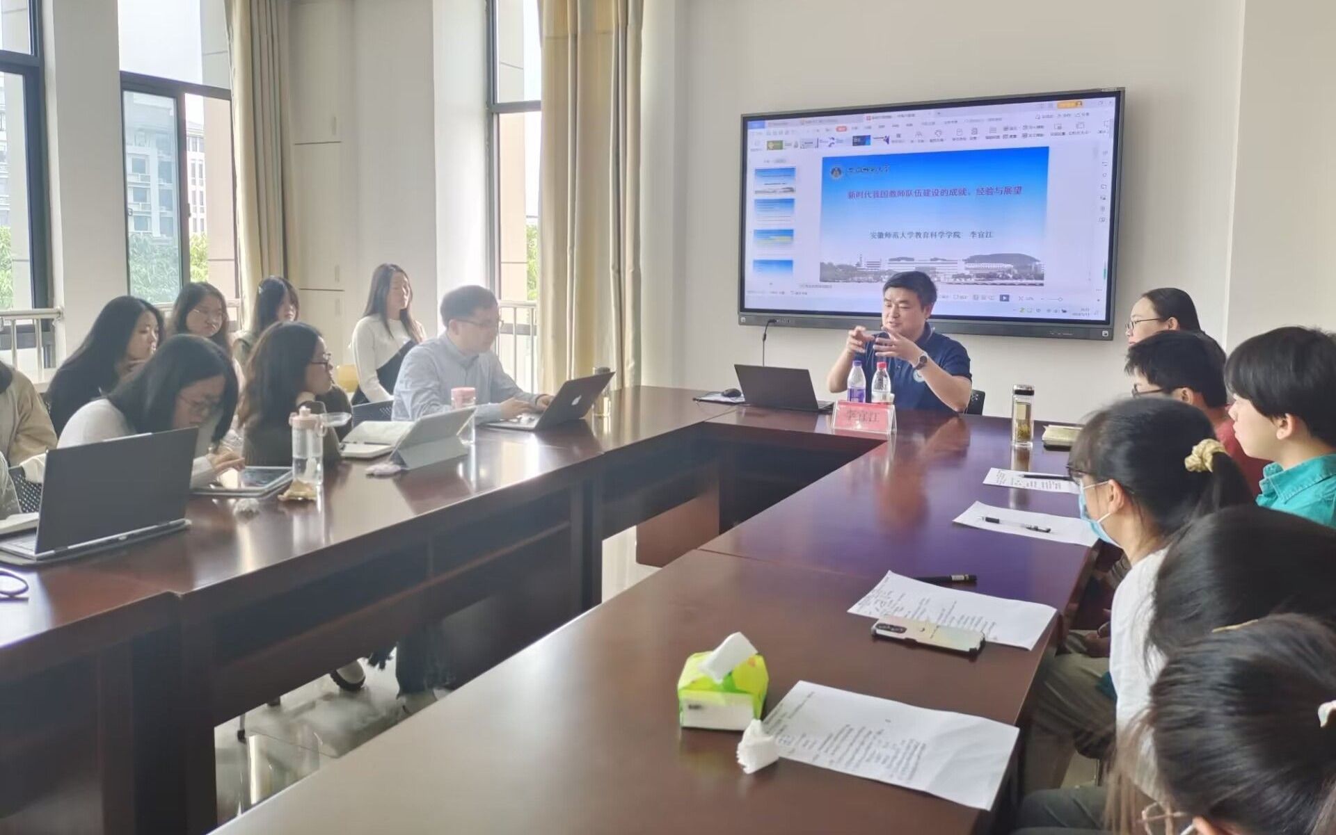 院长、教授、博士生导师李宜江在J202开展题为“新时代我国教师队伍建设的成就、经验与展望”的学术交流会,会议由副院长诸园主持,教师教育学院部分硕士研究生及本科生、教师现场聆听。