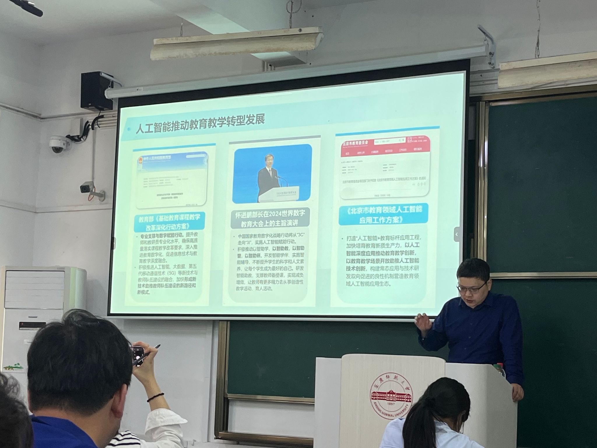 韦伟总结发言,认为在新一轮人工智能浪潮兴起之际,王亚飞副院长的讲座应时应景,既有人工智能理论和技术的阐述,富有很高的前瞻性;又有技术落地的典型应用,极具很强的实践性。教育技术学专业师生应当抓住人工智能发展机遇,学习AI技术、运用AI技术,做AI技术的驱动者和驾驭者,为国家数字强国战略和教育数字化转型作出“教技人”应有的贡献。(撰稿:韦伟 摄影:朱斌彬 审核:陈效飞)