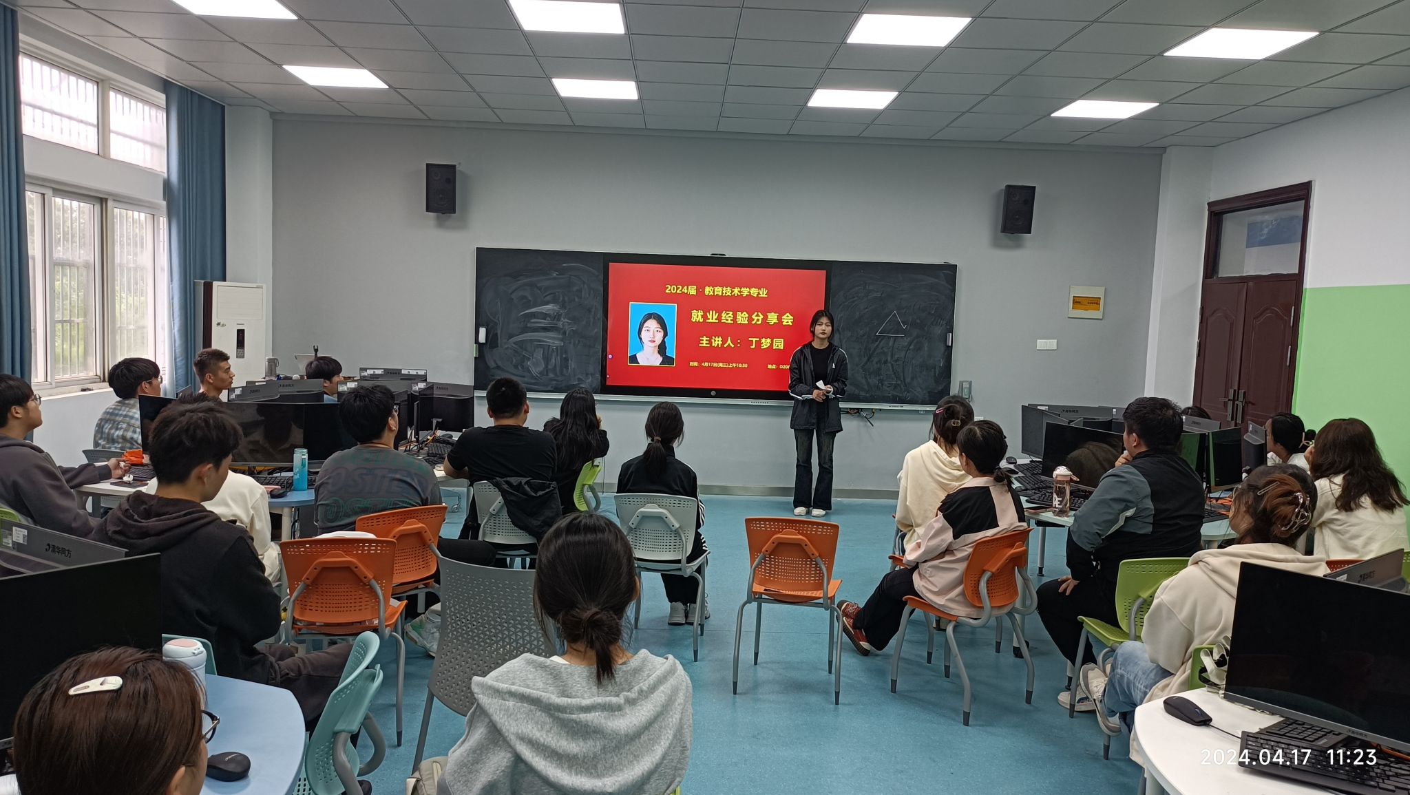 2024年4月17日,教师教育学院教育技术系在D206教室举行毕业生就业经验分享交流会。教育技术学2024届毕业生代表丁梦园担任主讲,2021级全体学生参加。活动由系主任韦伟主持。