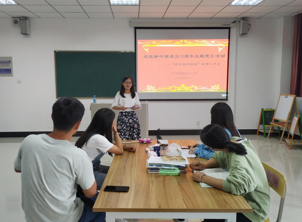9月27日下午,学生特殊教育党支部在J405教室组织开展庆祝新中国成立70周年主题党日活动,开展“我和我的祖国”故事分享会,活动由党支部书记刘文丽主持。