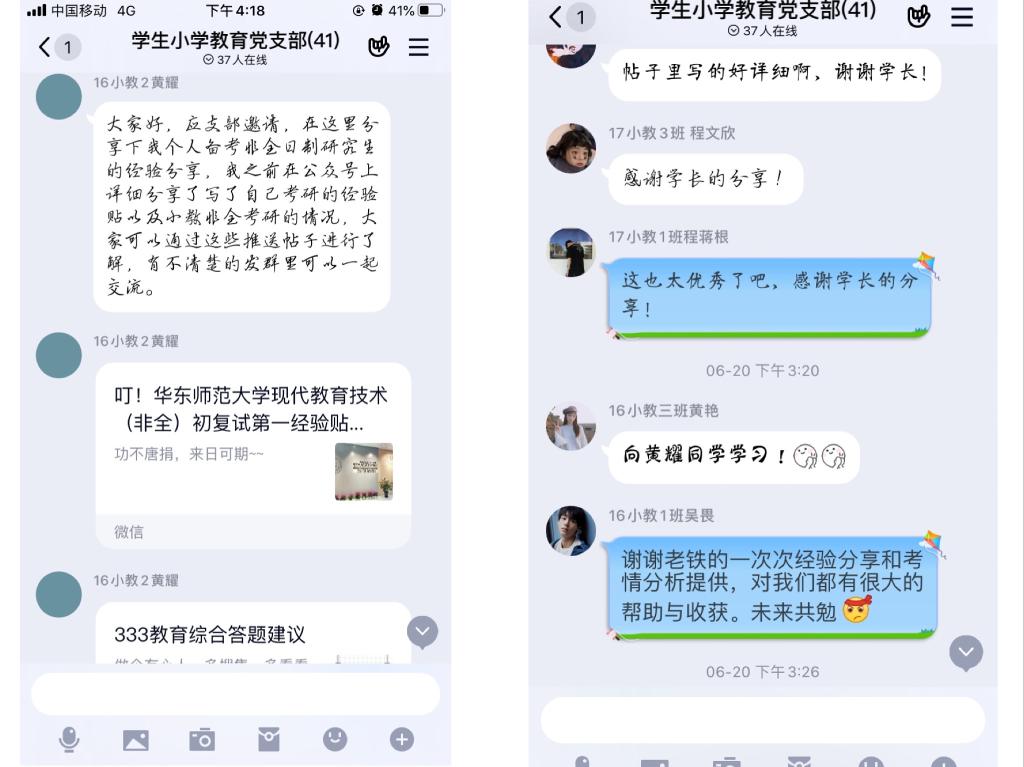 为提高支部党员的考研热情,明确考研目标。学生小学教育党支部于6月20日下午在线上举办考研经验分享会。本次会议由支部书记后娇娇老师组织,张雨欣担任此次分享会主持人,诚邀16级黄耀同学为大家做考研经验分享。学生小学教育党支部全体党员员参加了此次分享会。