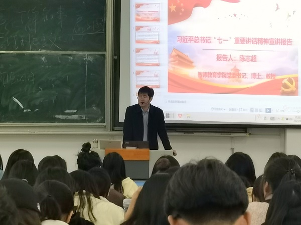 为深入学习贯彻习近平总书记在庆祝中国共产党成立100周年大会上的重要讲话精神,党史学习教育推深做实强化入党积极分子的思想政治教育,1110日下午,教师教育学院于C108开展了习近平总书记七一重要讲话精神宣讲报告报告由学院党委书记陈志超主讲,学院党委秘书唐凤霞、各学生党支部书记和第64期入党积极分子参加。