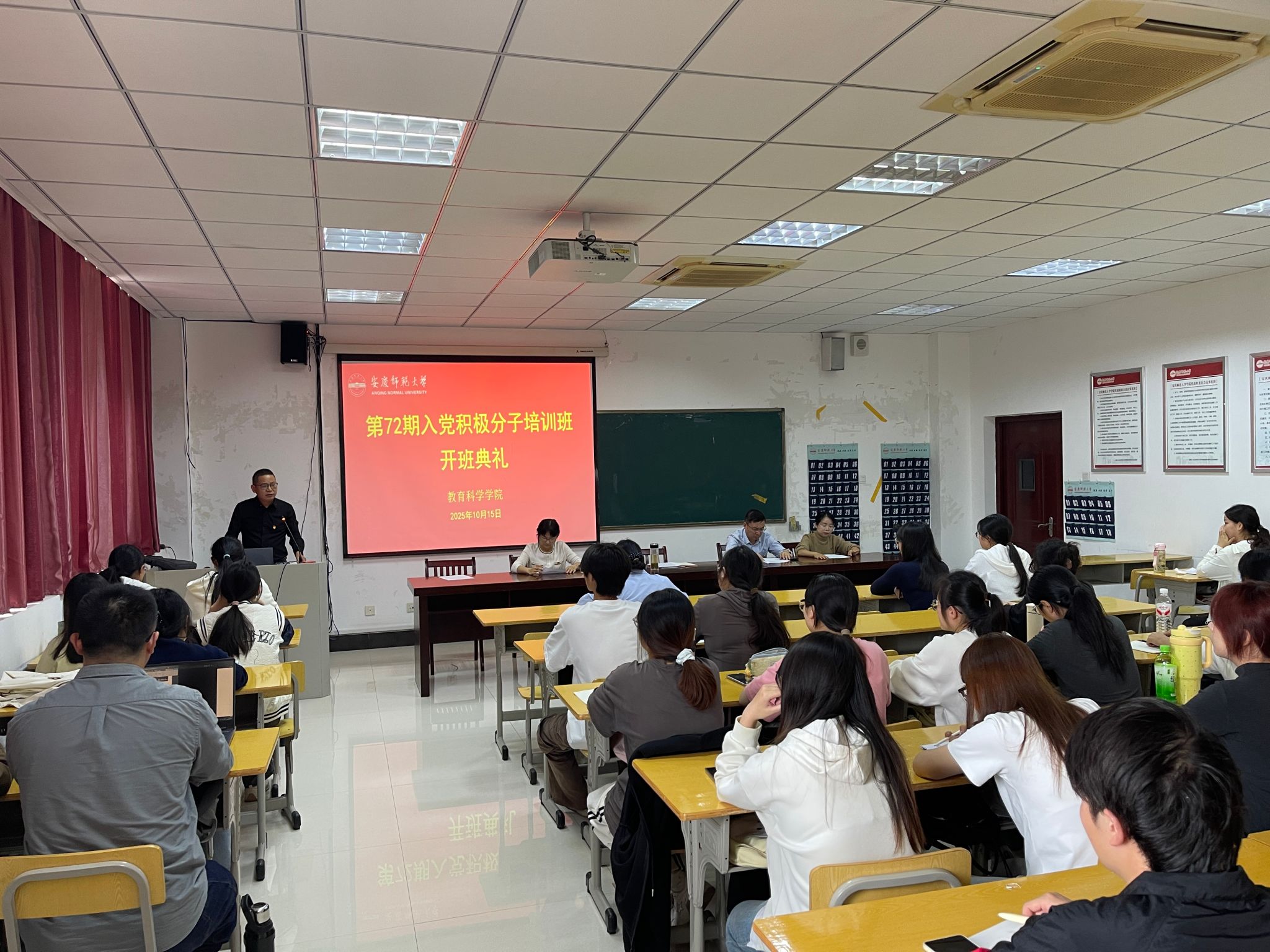 在J305教室举行第72期入党积极分子培训班开班典礼暨第一次专题党课。学院党委书记何孔蛟,党委副书记许世平,各学生党支部书记出席培训会。第72期全体入党积极分子参加会议。开班典礼由党委秘书汪洋洋主持。