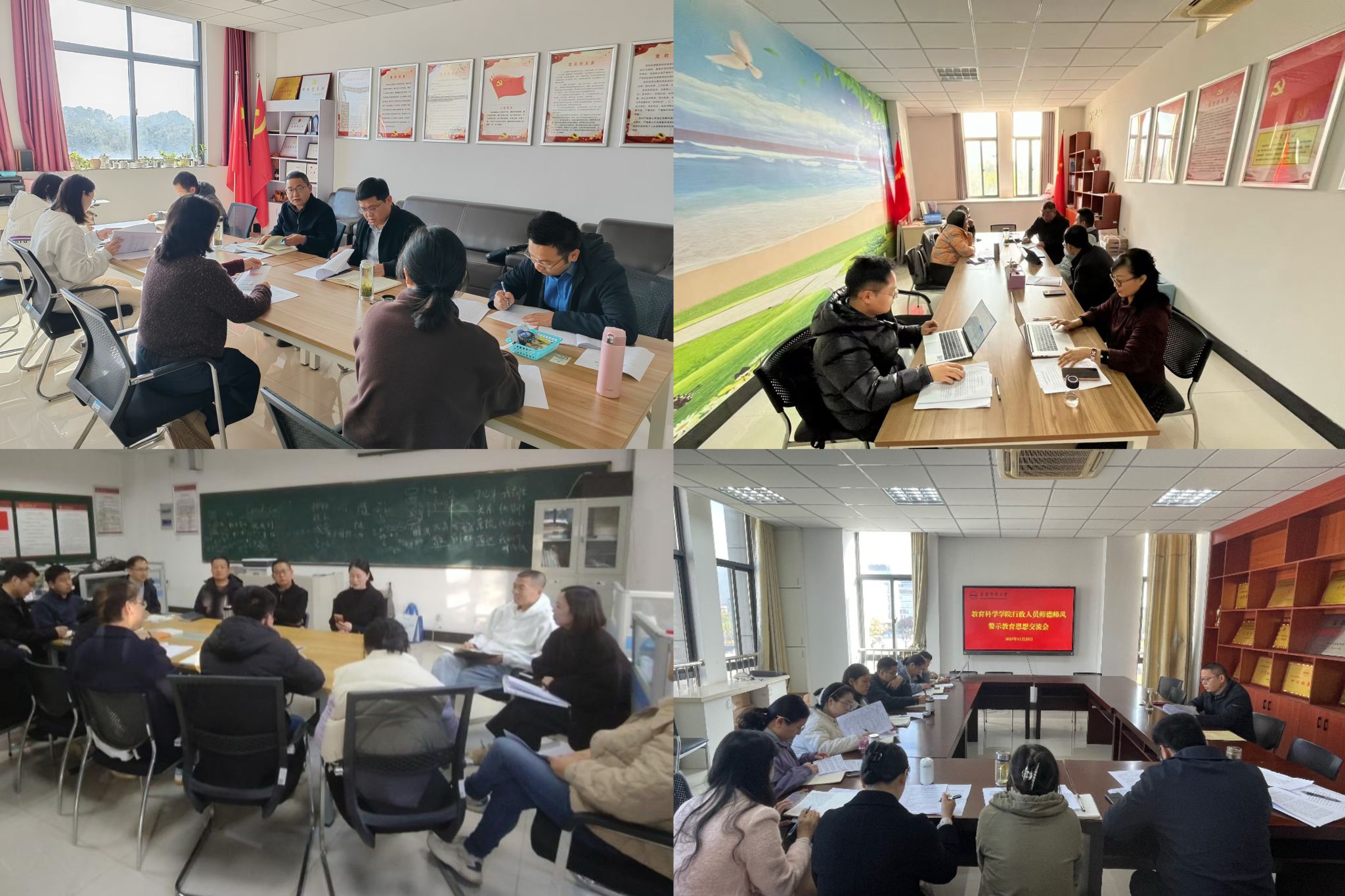 11月26日至12月3日,98色花堂 以各党支部(教研室)为单位召开师德师风建设警示教育思想交流会。学院领导何孔蛟、吴云助、许世平、陈效飞、王皓宇等分别列席指导联系的党支部(教研室)警示教育思想交流会。会议由各党支部书记(教研室主任)主持。全体教职工参加所在党支部(教研室)会议。