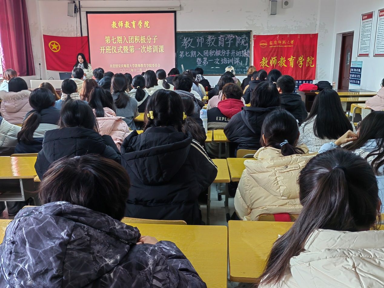 于J305教室举行第七期入团积极分子培训班开班仪式暨第一次培训课。院团委负责人姚强诚到会指导,全体入团积极分子到场参加,活动由团委实践委员汪南担任主持。