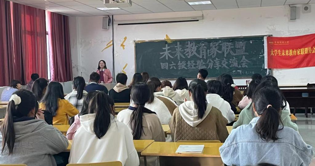 未来教育家联盟于J305教室举行四六级经验分享会,邀请王典和李娜两位四六级成绩均为600分以上的2020级同学分享,现场近180名学生参会。