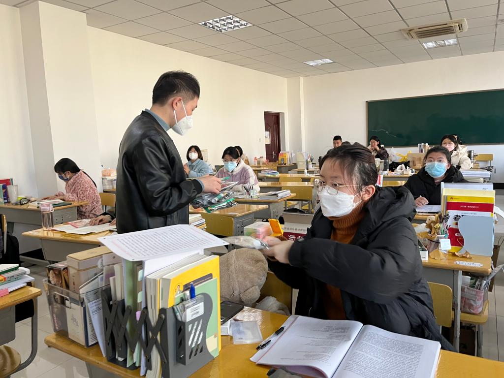 陈志超询问了学生近期学习和生活情况,为同学们答疑解惑,同时就当下寒冷天气如何做好考研规划和调节好心理状态做了针对性的引导。许世平强调,一要坚定考研信心;二要做好时间管理;三要调整好心态和生物钟;四要注意自身安全,无论在校内还是校外住宿考研的同学,一定要做好疫情防控防范,保护好自己的人身、财产安全。辅导员老师为备考学生发放了精心准备的慰问品。