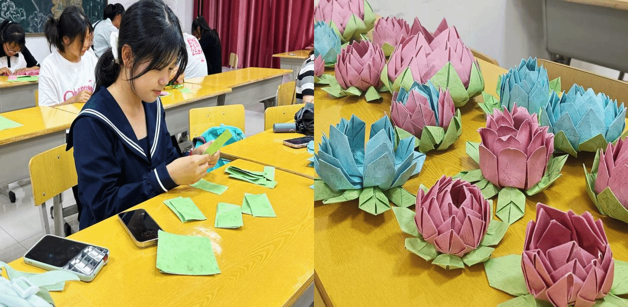 一盏花灯一片情。学生们在工作人员的指导下手工制作,绘图、剪花、组装、粘贴、系绳……大家有条不紊地进行各项制作程序。活动中,相互交流方法技巧分享生活点滴并交流感受。从叶子到花瓣,每一片,每一层都聚精会神、一丝不苟,一盏盏活灵活现的花灯慢慢在同学们手中“绽放”。同学们以花灯对祖国深情告白,以昂扬的青春面貌同庆盛世华诞。