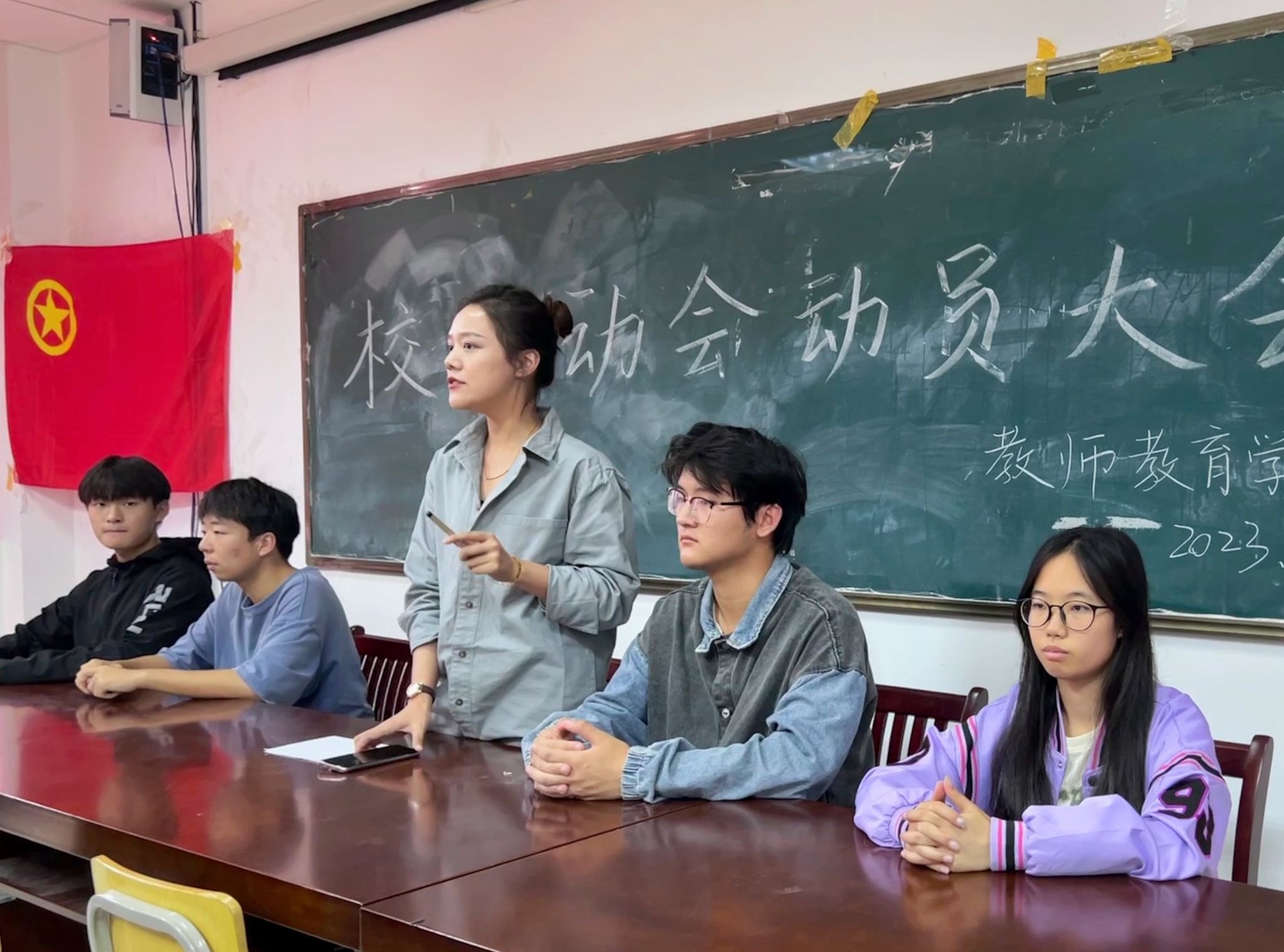 于J305教室召开校43届秋季田径运动会动员大会。院团委负责人姚强诚担任主持,学生会各部门负责人及全体运动员到场参会。