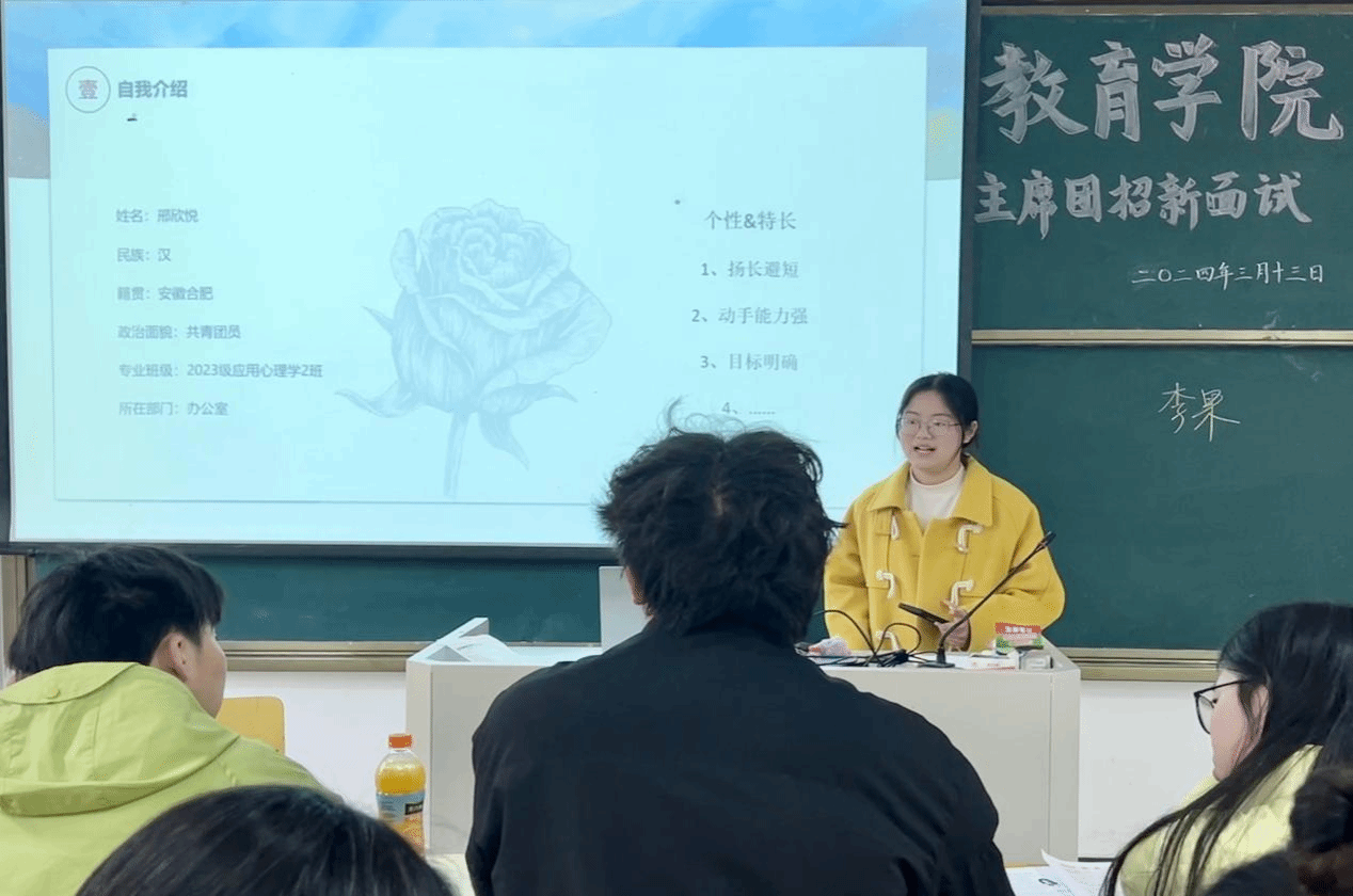本次面试分为竞选演讲和评委提问两个环节。秉承“公平、公正、公开”的原则,择优选择合适人选。竞选者依次上台进行简单的自我介绍,并阐述对竞选职位的理解及未来发展思路。评委进行针对性提问,考察竞选者的随机应变能力和语言组织能力。活动最后,院学生会执行主席吴妍进行总结发言:“此次面试,各位竞选者的表现都十分出彩,我从你们身上看到了蓬勃的朝气,无论是否入选主席团,我都希望你们能把这份热情与热血投入到今后的学习和工作中。”