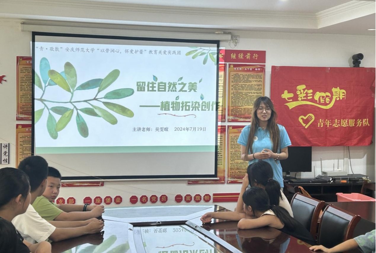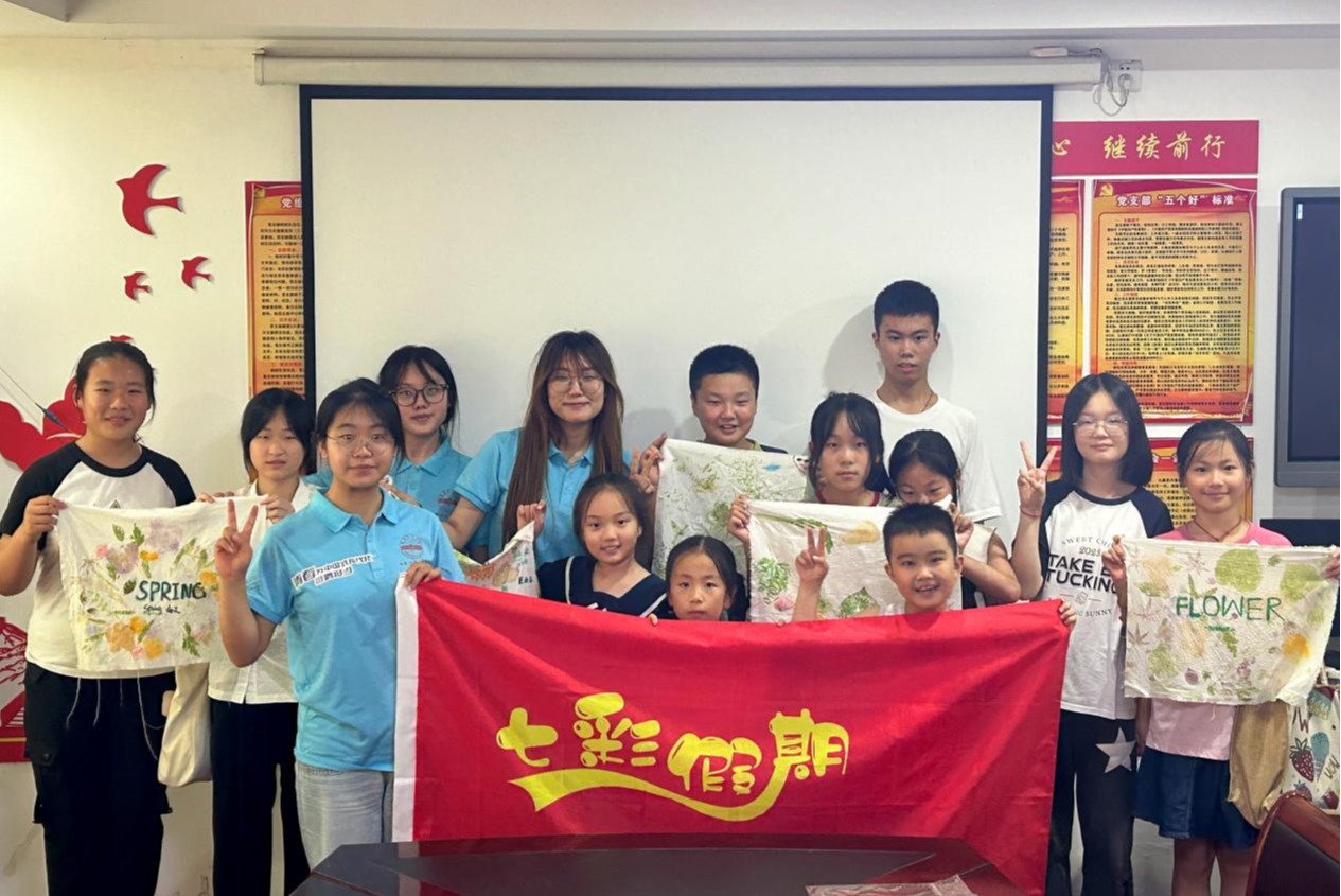 “以劳润心,怀爱护蕾”教育关爱实践团志愿者,共同为暑期公益课堂的学生们组织了一堂富有意义的“劳动+非遗文化”实践课程《留住自然之美——植物拓染创作》。