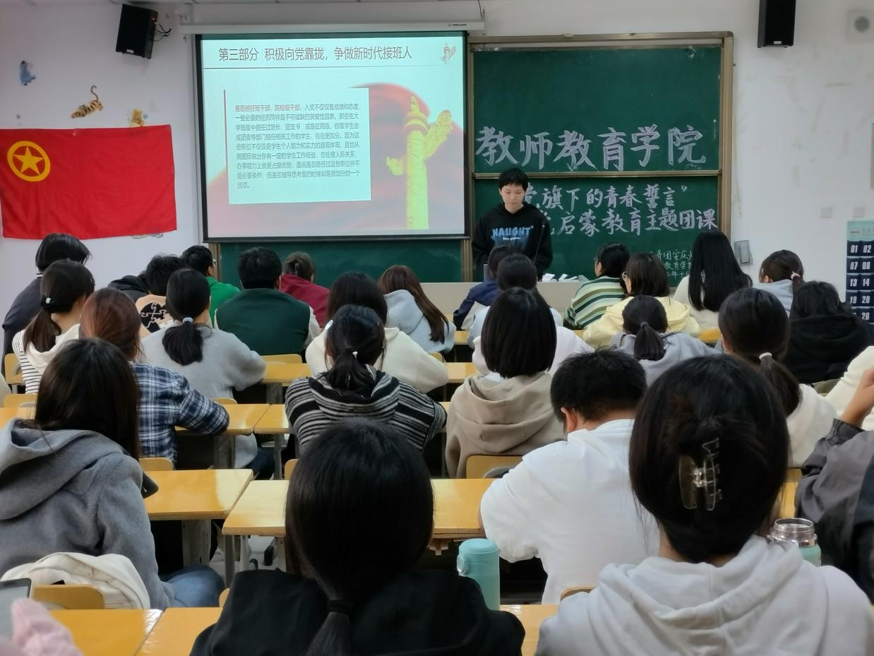 于J212教室开展“党旗下的青春誓言”——入党启蒙教育主题团课活动。活动由院团委学生副书记熊远志主持,全体入党积极分子到场参加。