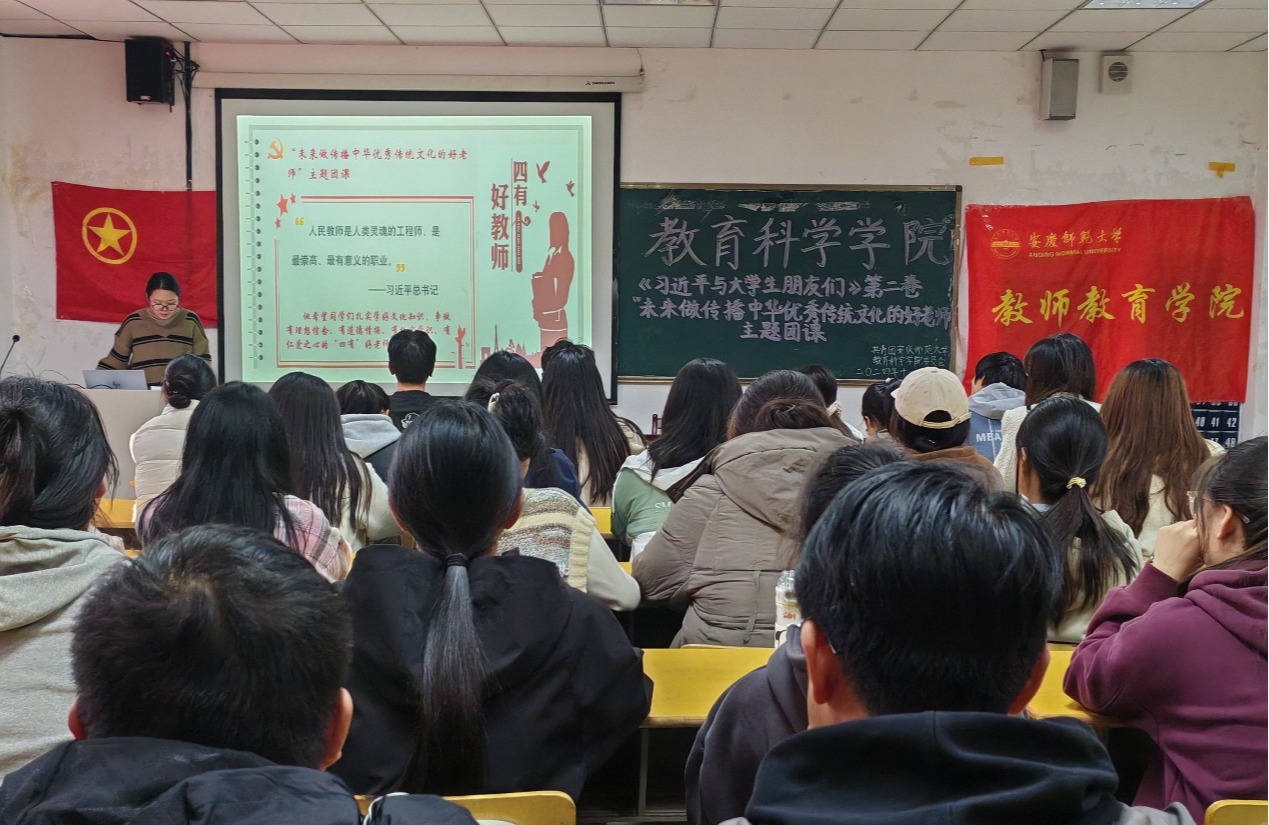 于J305教室开展“《习近平与大学生朋友们》第二卷第三课——未来做传播中华优秀传统文化的好老师”主题团课。本次活动由院团委实践委员余苏慧主持,学院全体团员积极参加。